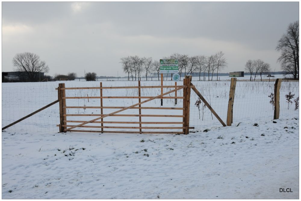 Im Februar 2013 konnte man bei Schnee gut die kleinen Stöckchen erkennen, die eingepflanzt waren. Ein Zaun schützte die Neuanpflanzung im Bürgerwald.