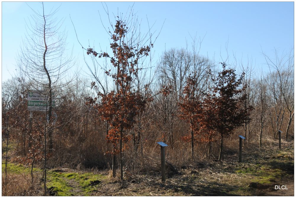 Im Februar 2019 zeigt sich der Bürgerwald Thiede von einer ganz anderen Seite. Schnee gab es in diesem Monat keinen. Der Baum des Jahres 2012 ist weit über das Schild "Bürgerwald" hinausgewachsen. Im Sommer ist das Schild hinter der ergrünten Lärche kaum mehr sichtbar.