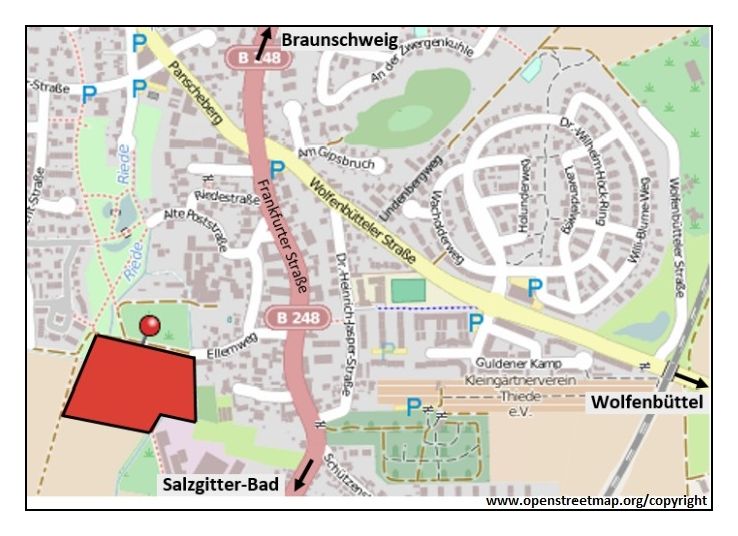 Der Bürgerwald Thiede befindet sich in 38239 Salzgitter, am Ende der Straße „Ellernweg“. Der Ellernweg zweigt von der B248 (Frankfurter Straße) ab - gegenüber der Kirche St. Georg.