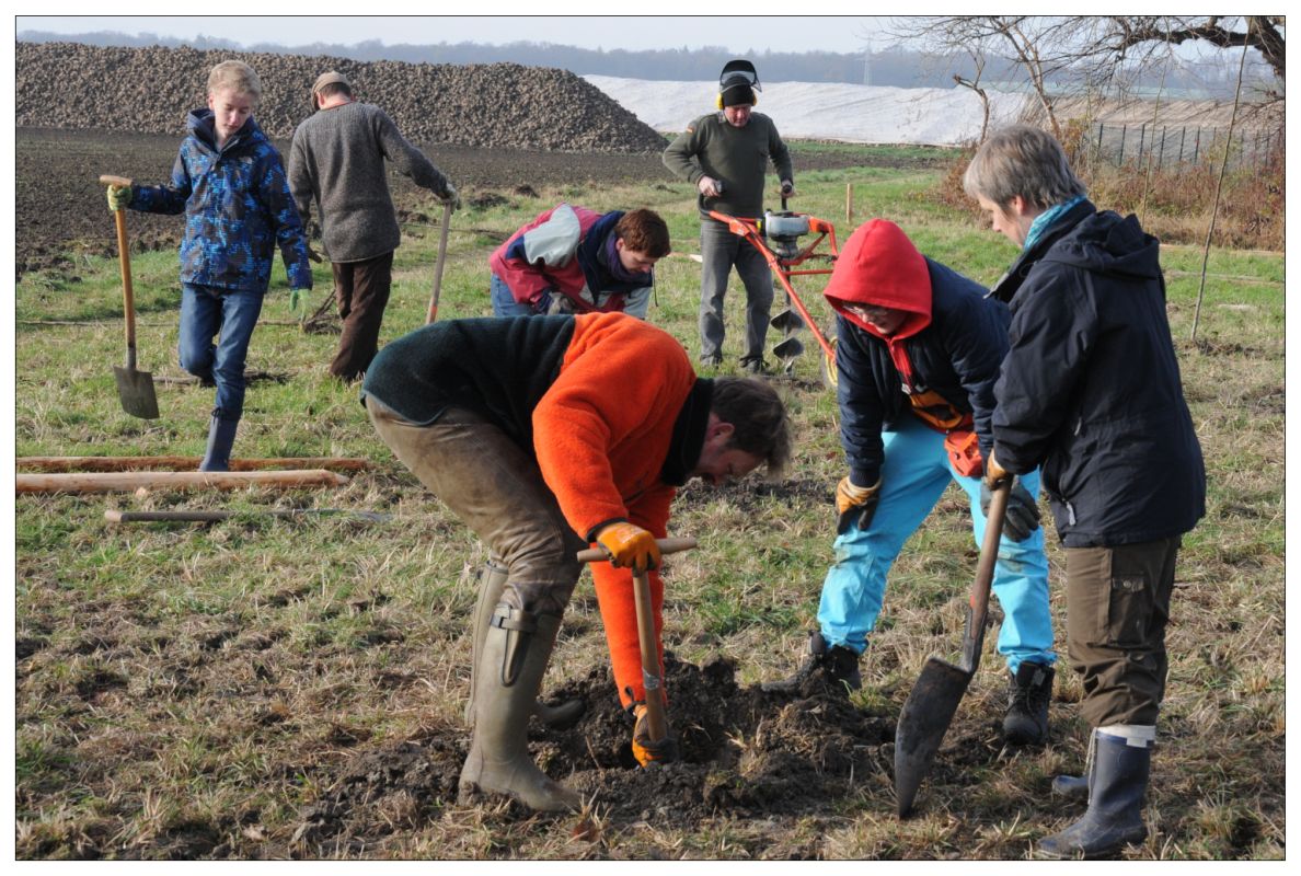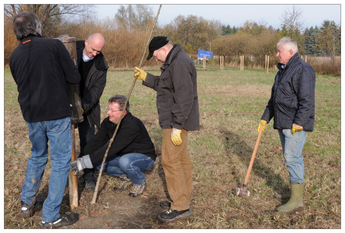Früh am Morgen war es noch neblig und leicht frostig. Doch die Mitglieder und Freunde des Fördervereins kamen schnell ins Schwitzen. Ein motorbetriebener Erdbohrer trieb tiefe Löcher in den teilweise verdichteten Boden. Mit Spaten und Schaufeln passten die Helfer die Pflanzlöcher an, um die etwa 2 bis 3 Meter hohen Jungbäume einzusetzen. Je zwei Holzpfähle wurden mit einer Ramme und großem Kraftaufwand neben den Walnüssen in den Boden gestampft. Daran angebunden finden die Stämmchen der Bäume Halt und Schutz.