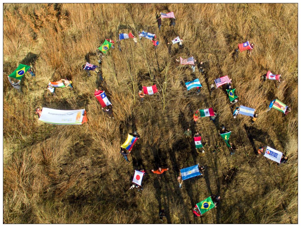 Ein besonderes Foto aus der Luftperspektive - aufgenommen mit einer Drohne - dokumentiert die Vielzahl der Nationen, aus denen Jugendliche bei der internationalen Aktion im Bürgerwald Thiede vertreten waren: