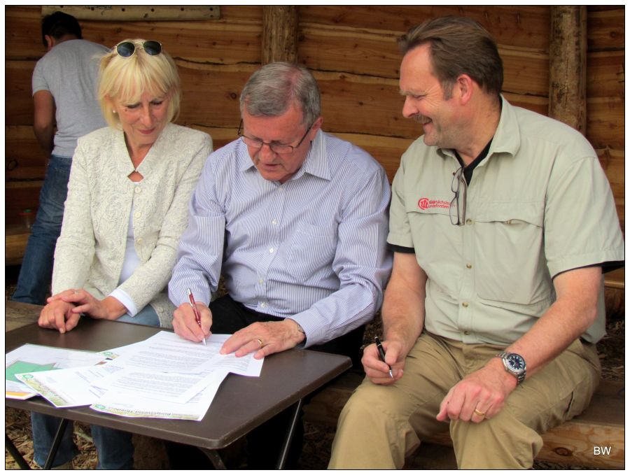 Wilhelm Schmidt, Vorstandvorsitzender des Fördervereins Bürgerwald Thiede, unterzeichnete gemeinsam mit Christiane Redecke, Vorstand der Mansfeld-Löbbecke-Stiftung, den Kooperationsvertrag. Hierzu trafen sie sich gemeinsam mit weiteren Gästen am Grünen Klassenzimmer im Bürgerwald. Unter anderem war auch der stellvertretende Vorstandsvorsitzende des Bürgerwaldes, Franz Hüsing, vor Ort.