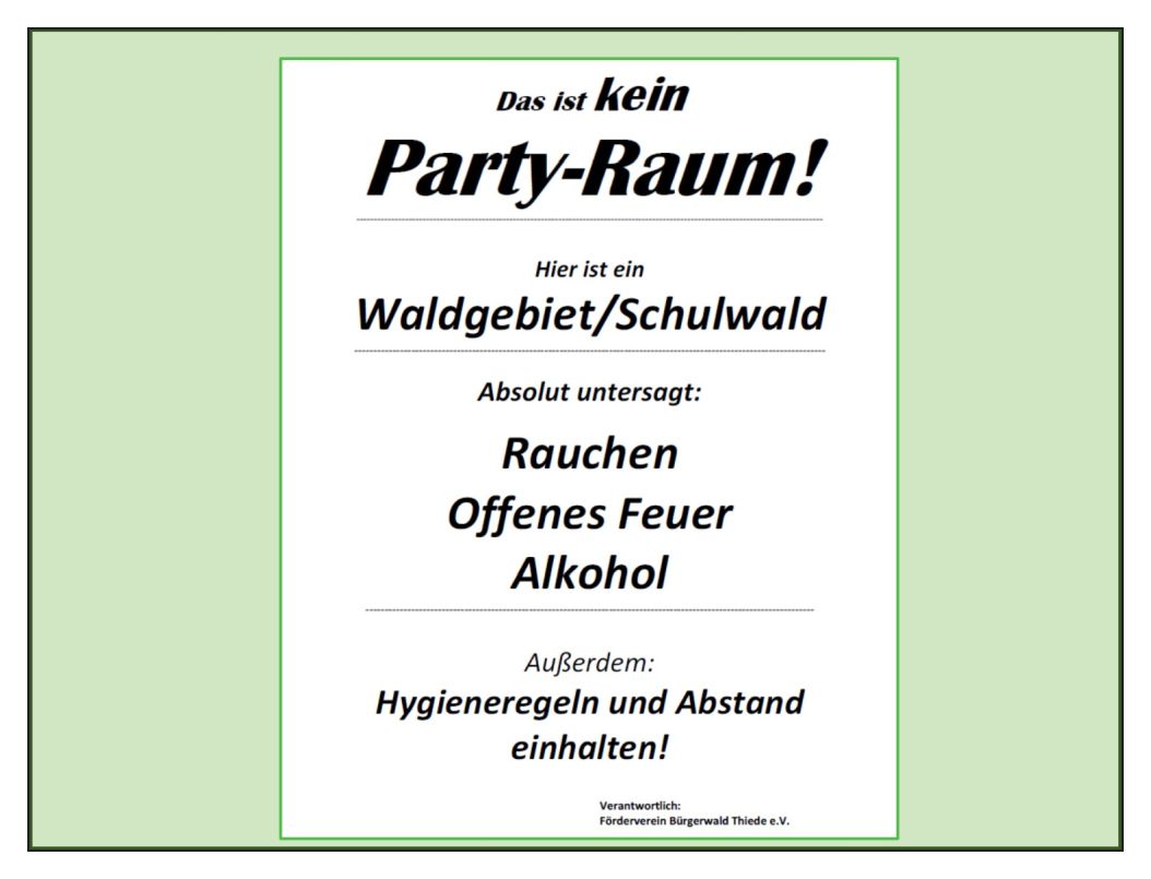 Im Grünen Klassenzimmer des Bürgerwalds Thiede findet sich ein neues Warnschild. Rauchen, offenes Feuer und Alkohol sind verboten. Aufgrund der Ereignisse der letzten Wochen sah sich der Vorstand des Fördervereins Bürgerwald Thiede gezwungen, ein solches Verbot auszusprechen.