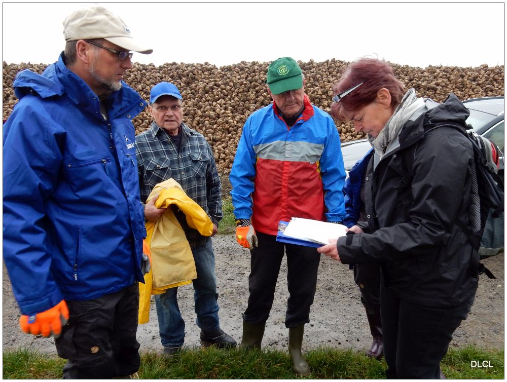 Die Rüben waren bereits gerodet und das Gelände vermessen. Innerhalb der Abgrenzungen markierten die Helfer mit Holzstäben jeweils das Zentrum der geplanten Pflanzkreise. Farblich markiert wurden die Stellen für die Bäume. Neben Eichen stehen unter anderen auch Linden und Buchen auf der Pflanzliste.