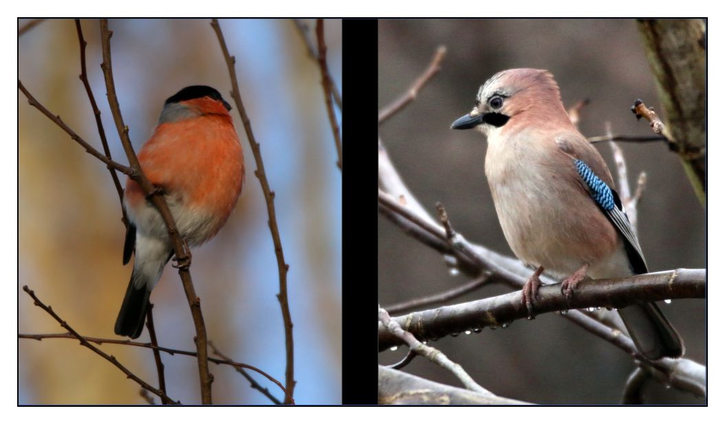 Markant mit roter Brust zeigt sich der Gimpel – auch Dompfaff genannt. Er knabbert gerne die Knospen an den Bäumen. Ebenfalls unverkennbar durch die schwarz-weiße Flügelzeichnung und das blau schillernde Flügelfeld ist der Eichelhäher ein häufiger Gast im Bürgerwald Thiede.